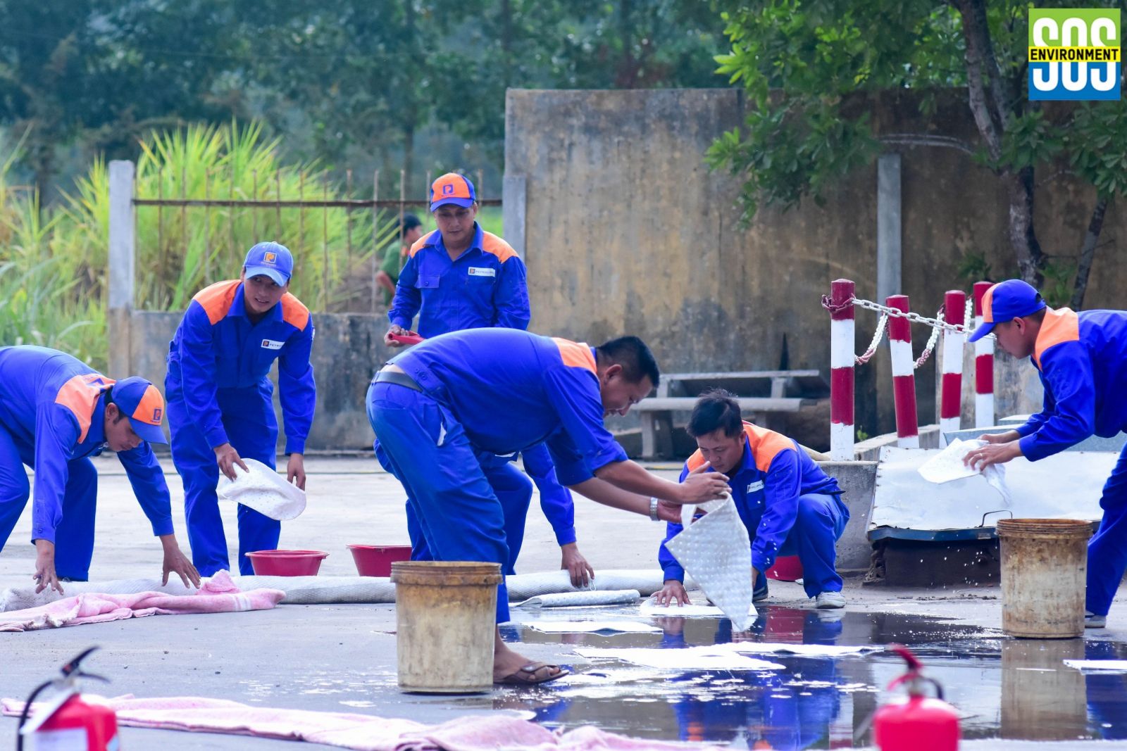 Nhân viên một CHXD của Petrolimex diễn tập phương án ứng phó sự cố tràn dầu