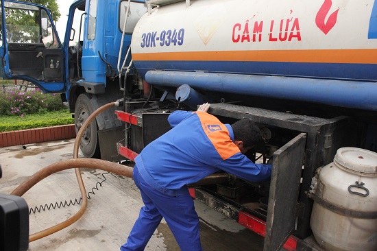 Nhân viên kỹ thuật thực hiện các thao tác tháo lắp đường ống thu hồi hơi xăng trong quá trình nhập hàng tại CHXD