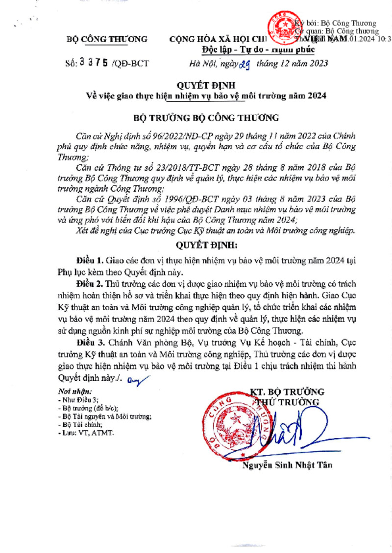 Tiêu đề văn bản | Về việc giao thực hiện nhiệm vụ bảo vệ môi trường năm 2024 | ||