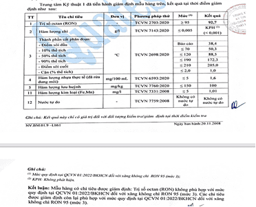 Tại thời điểm kiểm tra, Đoàn kiểm tra đã kiểm tra nhanh một số chỉ tiêu cơ bản của xăng RON 95-III đang bán tại cửa hàng kết quả có trị số Octan là 93,1 trong khi mức quy định tối thiểu trị số Octan là 95.