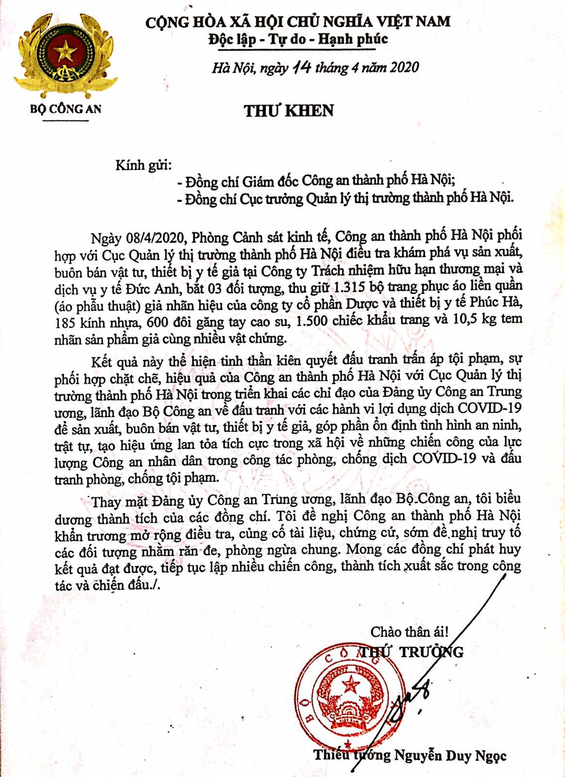Ngày 14/4/2020, Cục QLTT Hà Nội đã nhận được thư khen của Bộ Công an trong phối hợp đấu tranh trấn áp tội phạm hình sự trong hoạt động sản xuất, buôn bán vật tư, thiết bị y tế giả.