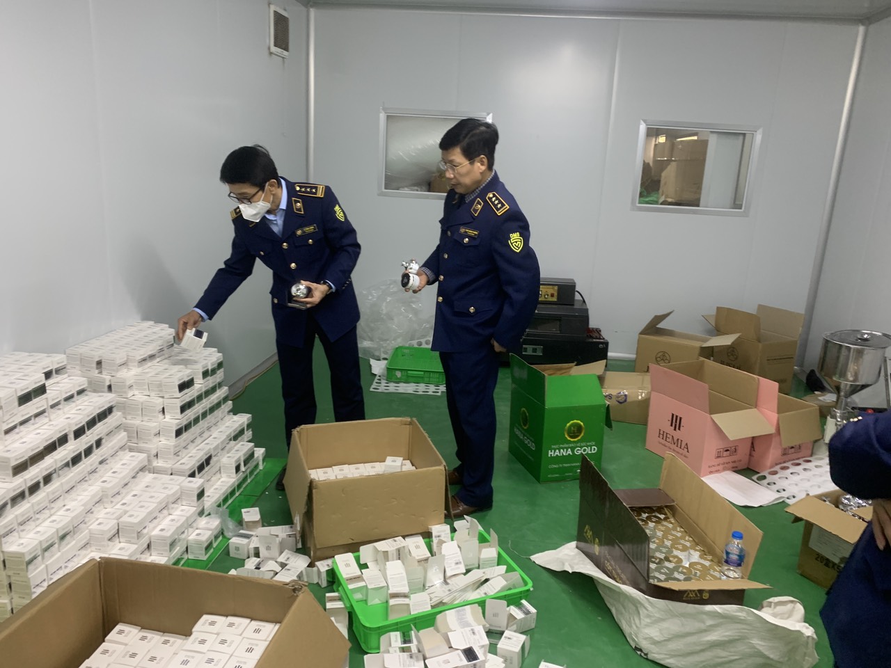 Tại hiện trường chủ cơ sở đang cùng 8 công nhân đóng gói các sản phẩm mỹ phẩm, thực phẩm chức năng dành cho trẻ em và người lớn mang các nhãn hiệu HEMIA, JUSHI, QUEEN PERFECT, HANA GOLD, HANA SLIM…