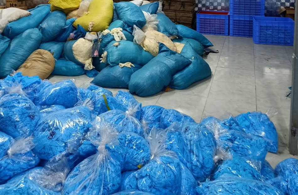9,5 tấn găng tay cao su có dấu hiệu bẩn thỉu, nhăn nhúm, không đảm bảo chất lượng được chứa trong hàng trăm bao tải cùng gần 200 thùng găng tay đã được đóng thùng nhãn hiệu VN Gloves vừa bị lực lượng QLTT Bắc Ninh thu giữ.