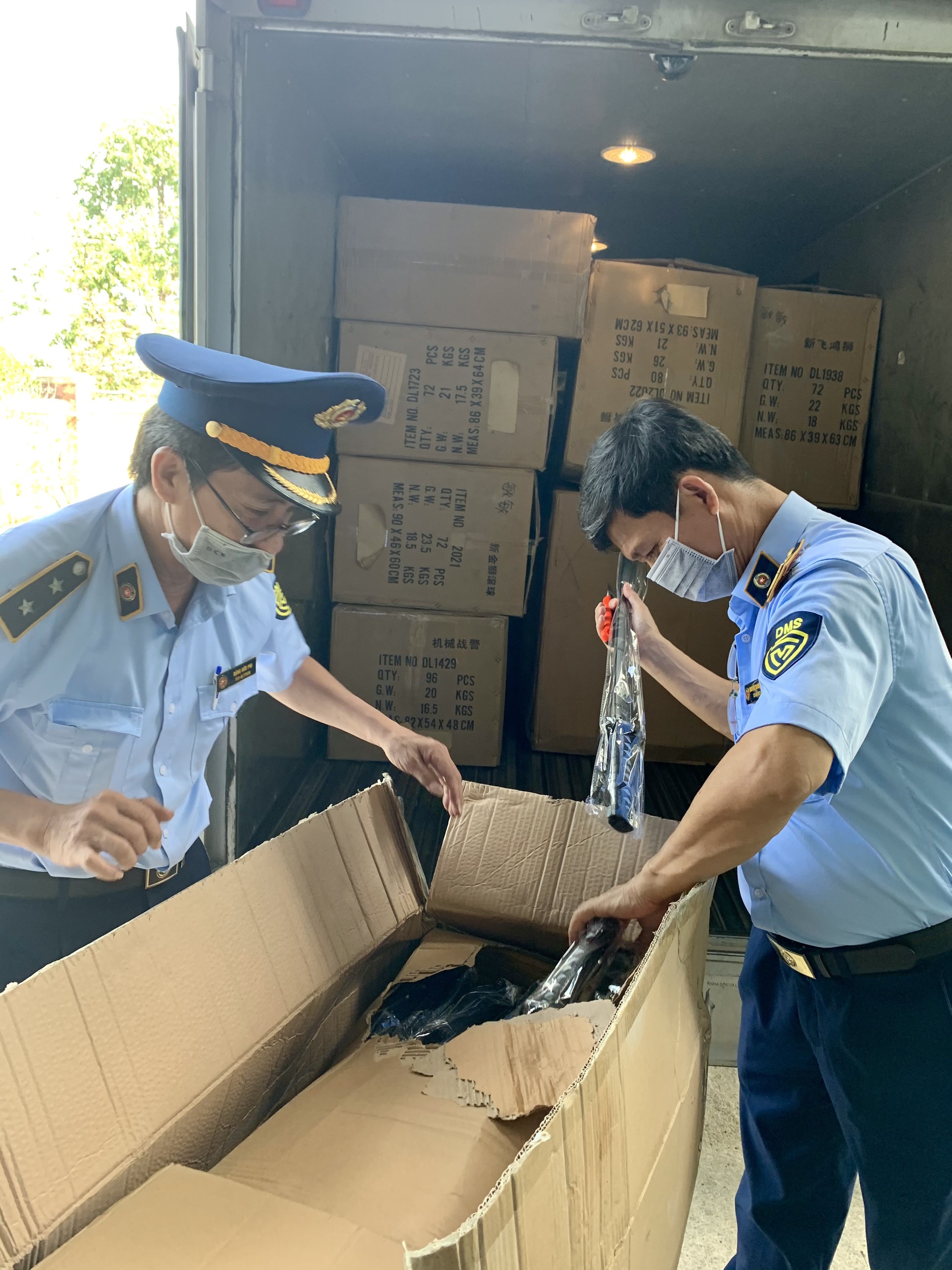 Qua kiểm tra, phát hiện trên xe vận chuyển hơn 1.000 sản phẩm đồ chơi trẻ em các loại bằng nhựa có hình dạng khác nhau như: lồng đèn, máy bay, xe ô tô, xe cảnh sát… hình súng, hình kiếm; hơn 80 đôi dép quai hậu và balo các loại.