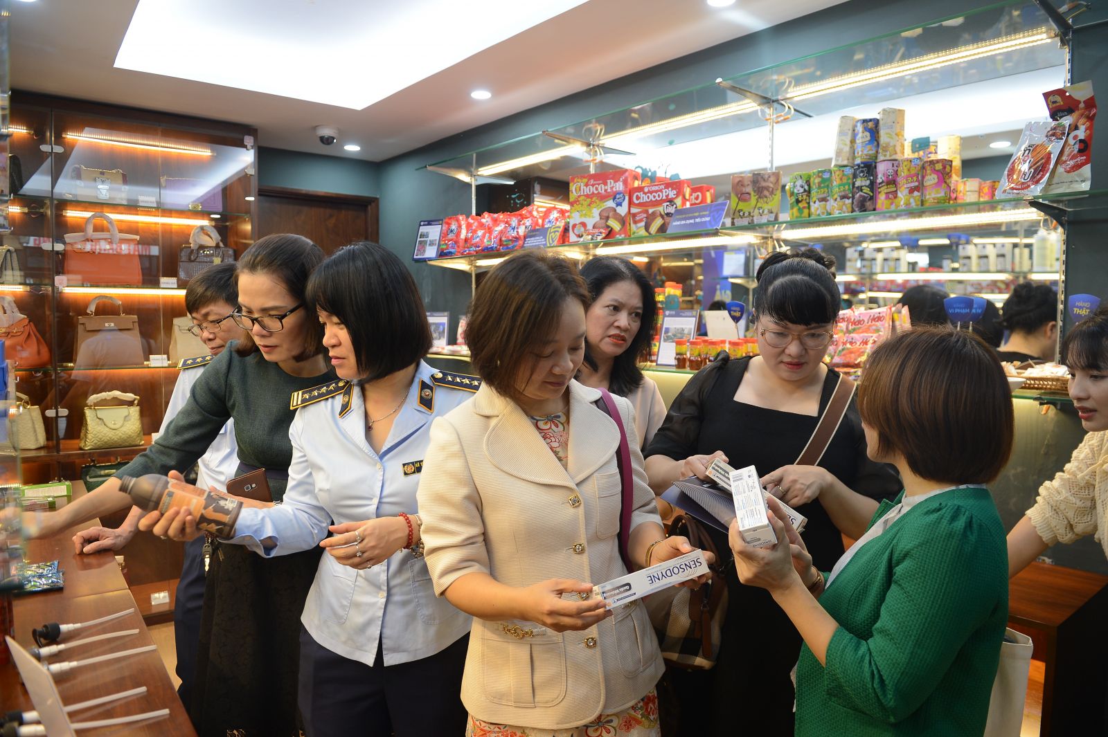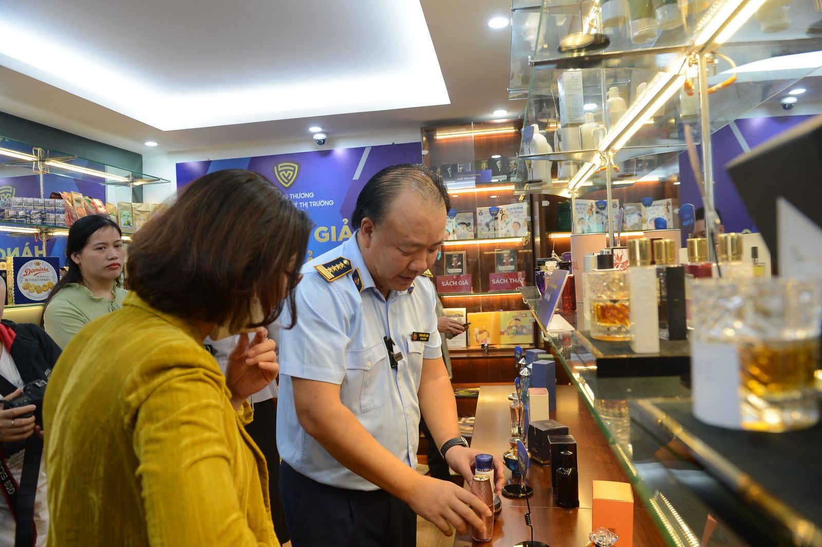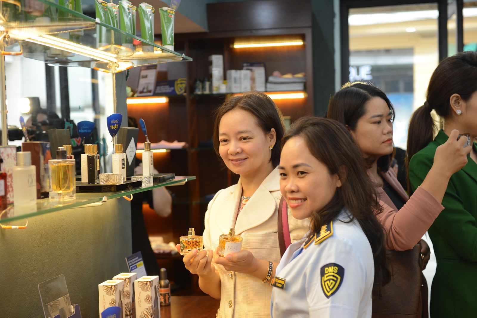 Tổng Cục trưởng Trần Hữu Linh hướng dẫn khách tham quan cách nhận diện hàng thật, hàng giả