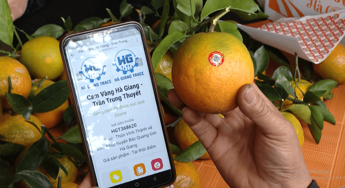 Sản phẩm Cam Vàng Hà Giang được dán tem truy xuất nguồn gốc.