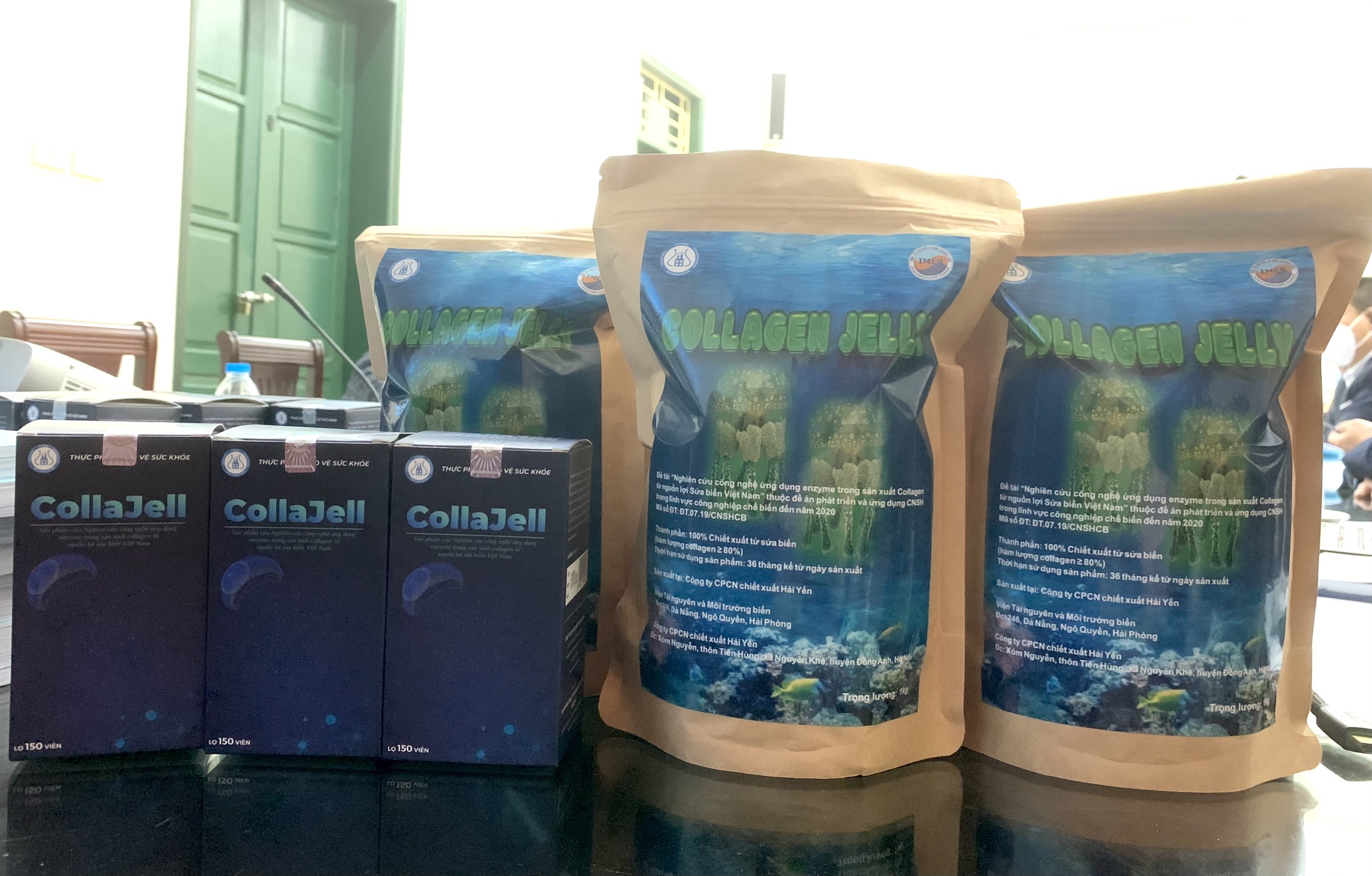 Viện Tài nguyên môi trường biển đã sản xuất được tổng số 75.000 viên nang thực phẩm chức năng chứa collagen, hàm lượng >= 200 mg/viên, (trong đó 15.000 viên đang được giới thiệu sản phẩm tại các cửa hàng thuốc của Công ty TNHH Thương mại và Dược phẩm Thiện Nhân). Sản phẩm đảm bảo độ an toàn và chất lượng theo quy định của Bộ Y tế. Nhóm nghiên cứu đã thiết lập được hồ sơ cơ sở về tiêu chuẩn và chất lượng nguyên liệu sứa, sản phẩm bột Collage Jelly từ sứa biển Việt Nam, viên nang thực phẩm chức năng CollaJell chứa collagen.