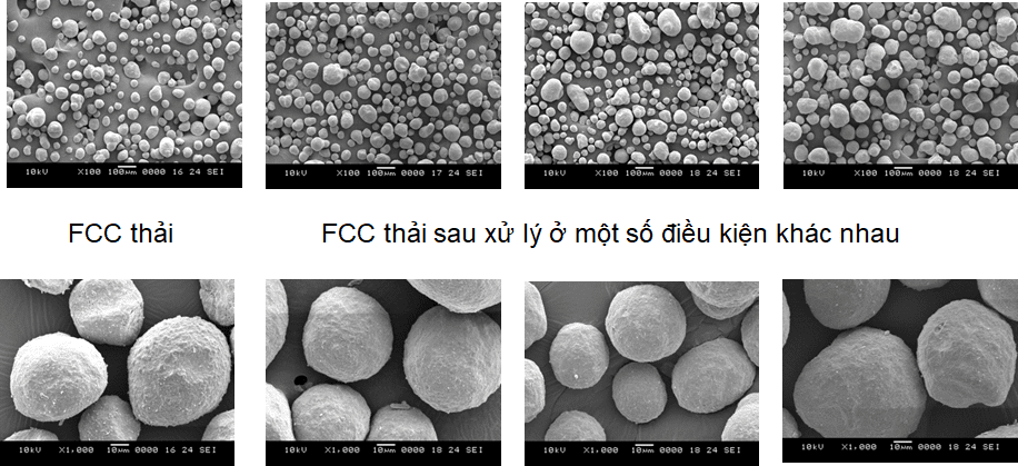 Kết quả thực nghiệm cho thấy xúc tác FCC thải sau khi xử lý đã loại bỏ được cốc bám bề mặt và một phần kim loại nhiễm tạp (Ni, V, Fe…), đồng thời mở rộng các kênh mao quản (tăng diện tích bề mặt lên gấp đôi) trong khi đó các thành phần nguyên tố chính (Al2O3, SiO2, đất hiếm), độ bền cơ lý và kích thước hạt xúc tác FCC vẫn được bảo toàn.