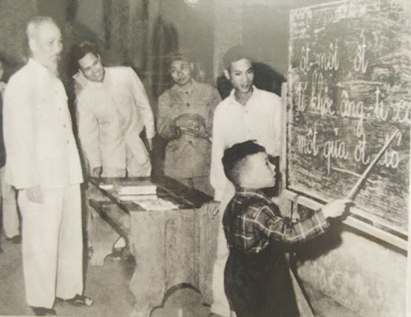 Chủ tịch Hồ Chí Minh thăm một lớp học của phong trào bình dân học vụ. Ảnh tư liệu