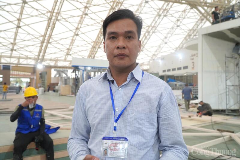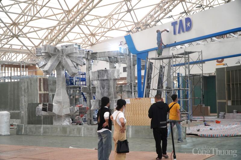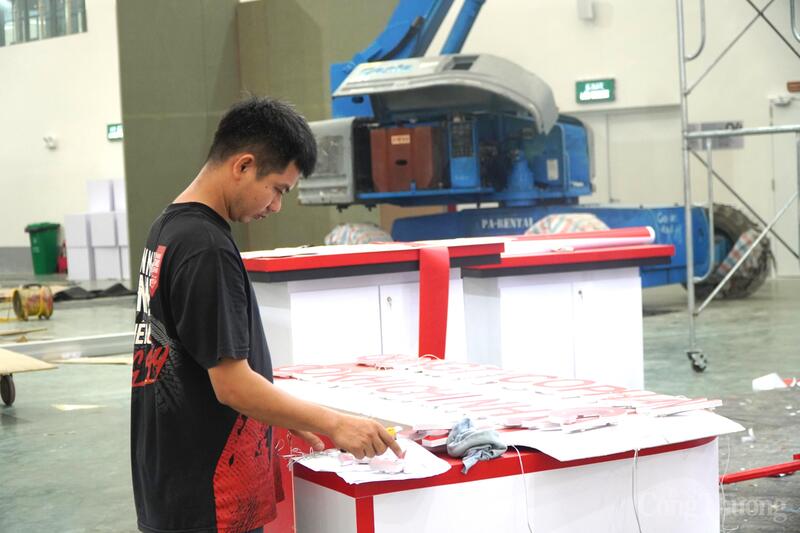 Đại diện nhà thầu thi công gian hàng triển lãm thành tựu ngành Công Thương cho biết, đang đẩy nhanh tiến độ thi công, thậm chí làm việc cả đêm