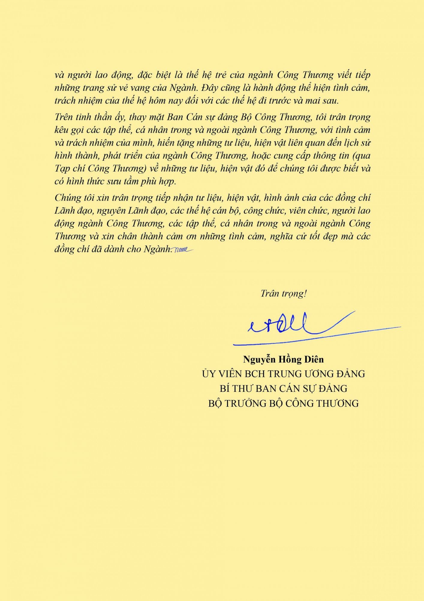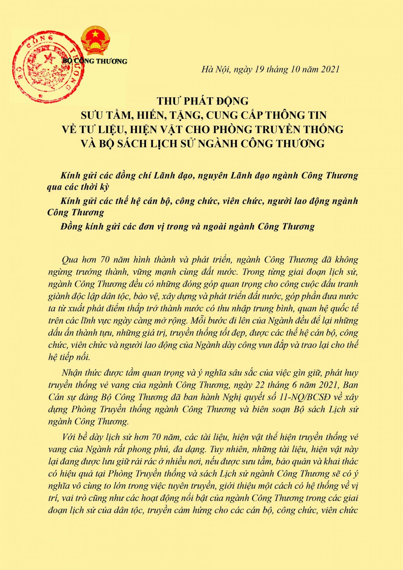 Sau đây là toàn văn thư phát động sưu tầm, hiến, tặng, cung cấp thông tin về tư liệu, hiện vật cho Phòng Truyền thống và Bộ sách Lịch sử ngành Công Thương của 33Win là nhà cái 33win cá cược trực tuyến hàng đầu Châu Á Nguyễn Hồng Diên: