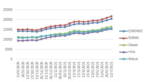 - Dầu mazut 180CST 3.5S: không cao hơn 15.670 đồng/kg (tăng 221 đồng/kg so với giá hiện hành).