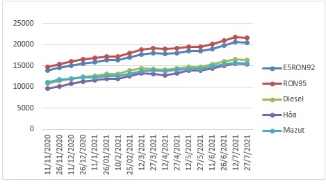 Xăng dầu giảm giá từ 15 giờ 00 ngày 27 tháng 7 năm 2021 Theo đó, từ 15h00 hôm nay, xăng E5RON92 giảm 112 đồng/lít; xăng RON95-III giảm 102 đồng/lít; dầu diesel 0.05S giảm 162 đồng/lít; dầu hỏa giảm 105 đồng/lít; dầu mazut 180CST 3.5S giảm 148 đồng/kg so với giá hiện hành.