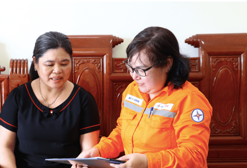 Điện lực huyện Giao Thuỷ tuyên truyền vận động hộ gia đình ở thị trấn Ngô Đồng sử dụng điện an toàn, tiết kiệm, hiệu quả trong mùa nắng nóng. Ảnh Xuân Thu