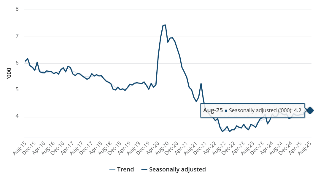 Tỷ lệ thất nghiệp tại Úc trong tháng 8/2025 tương đương tháng trước, ở mức 4,2%, trong đó, tính theo phương pháp thống kê điều chỉnh theo mùa (seasonally adjusted), số người có việc làm đạt trên 14,6 triệu, tăng 217 nghìn người (+1,5%) so với cùng kỳ 2024; số người thất nghiệp hơn 647 nghìn, tăng 28,1 nghìn người (+4,5%) so với cùng kỳ 2024.
