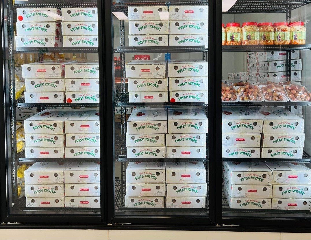 Vải tươi Ưu Đàm đi máy bay được bày bán và bảo quản cẩn thận trong tủ mát tại thành phố Melbourne