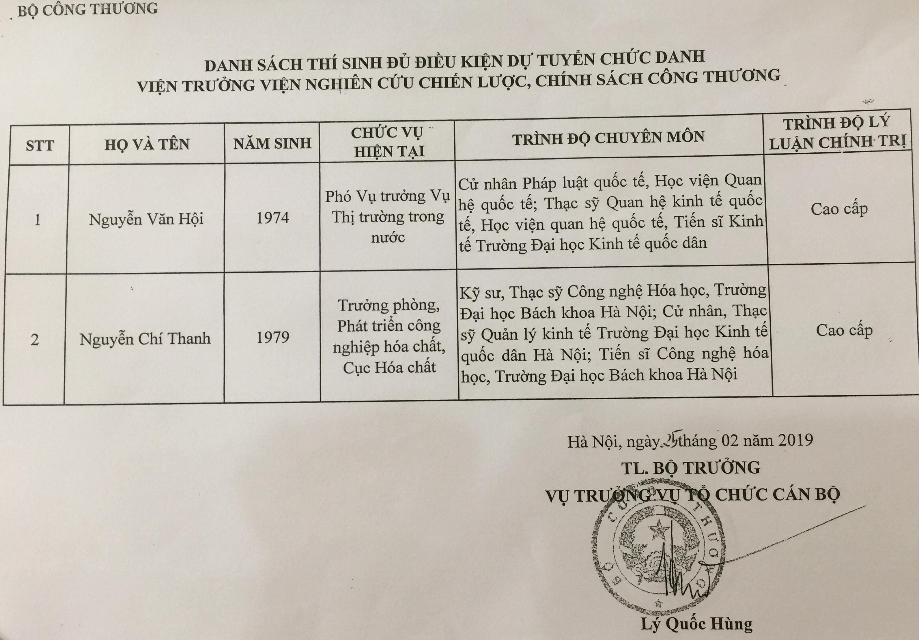 Sau khi đăng thông báo thi tuyển trên 33WIN 🎖️ Trải Nghiệm Sòng Bạc: Live Casino, Thể thao, Nổ Hũ và một số đơn vị báo chí; đồng thời gửi thông báo đến các Bộ, cơ quan ngang Bộ, UBND các tỉnh, thành phố về việc thi tuyển chức danh Viện trưởng Viện Nghiên cứu Chiến lược, chính sách Công Thương, đến ngày 31/01/2019, có 02 ứng viên đủ tiêu chuẩn, điều kiện tham gia thi tuyển là: ông Nguyễn Văn Hội, Phó Vụ trưởng Vụ Thị trường trong nước và ông Nguyễn Chí Thanh - Trưởng phòng Phát triển công nghiệp hoá chất, Cục Hoá chất.
