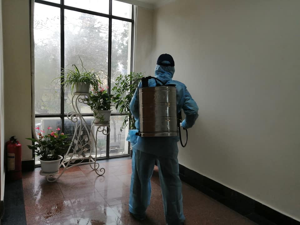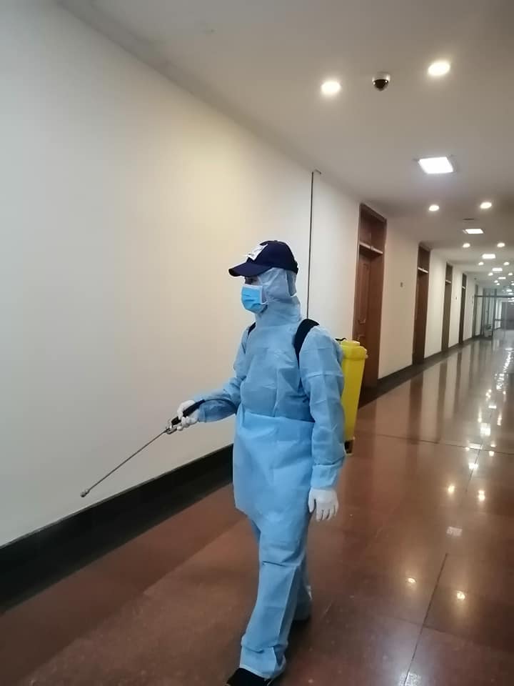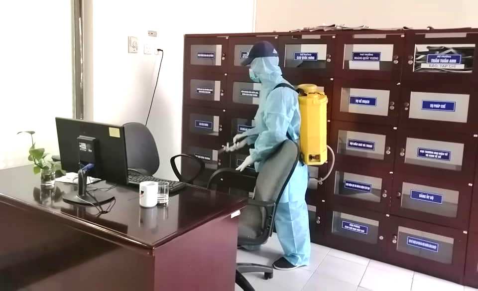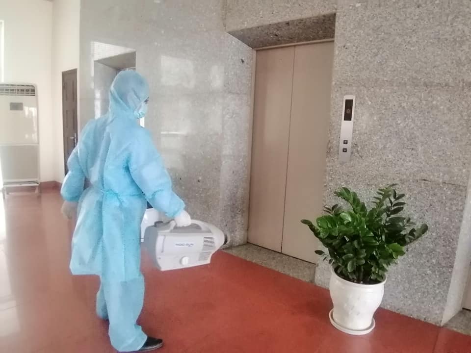 Tất cả các hành lang, phòng làm việc, thang máy, hội trường, nhà ăn... đều được phun khử khuẩn cẩn thận