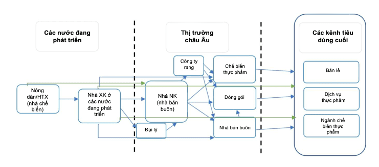 Các nhà bán lẻ hiếm khi mua trực tiếp từ các nhà xuất khẩu ở các nước đang phát triển. Tuy nhiên, một số nhà xuất khẩu (nhà chế biến) ở các nước đang phát triển đóng gói sản phẩm của họ trực tiếp để dán nhãn riêng. Gần đây, lĩnh vực bán lẻ ngày càng trở nên phân cực, chứng kiến sự chuyển hướng sang phân khúc chiết khấu hoặc phân khúc cao cấp. Hợp nhất, bão hòa thị trường, cạnh tranh khốc liệt và giá thấp là những đặc điểm chính của thị trường bán lẻ thực phẩm châu Âu.
