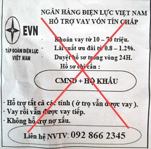 Cảnh báo giả mạo thương hiệu EVN để quảng cáo cho vay tín chấp Trong thời gian gần đây, trên địa bàn thành phố Hồ Chí Minh và một số tỉnh, thành phố khu vực phía Nam xuất hiện các tờ rơi đăng tải thông tin hỗ trợ vay tín chấp dưới dạng giả mạo và lợi dụng hình ảnh, logo và tên của Tập đoàn Điện lực Việt Nam (EVN).