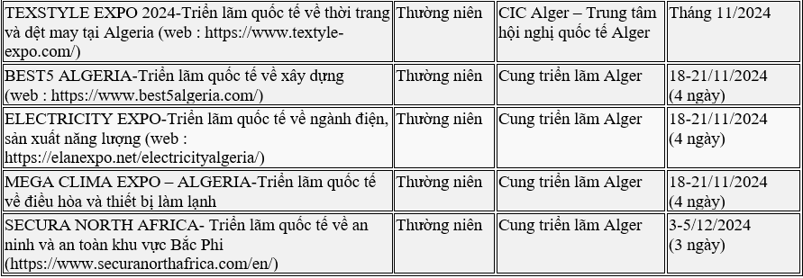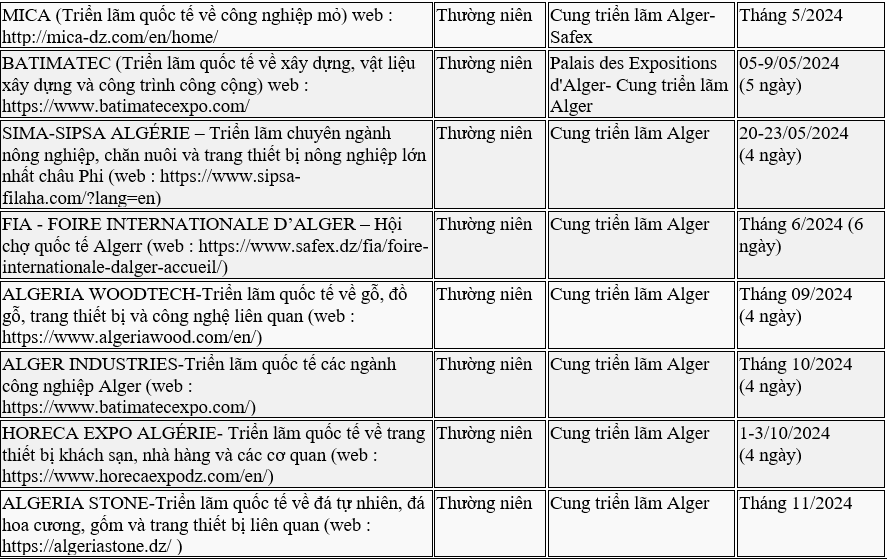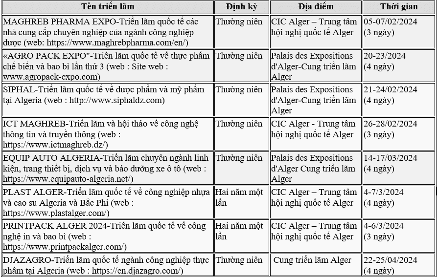 Thương vụ Việt Nam tại Algeria giới thiệu Danh sách hội chợ, triển lãm quốc tế tại thủ đô Alger, Algeria năm 2024 để các hiệp hội, 66Win33 tặng code miễn phí quan tâm đăng ký tham dự. Để tìm hiểu thông tin chi tiết, cơ quan, 66Win33 tặng code miễn phí có thể truy cập website của triển lãm hoặc liên hệ với Thương vụ Việt Nam tại Algeria theo địa chỉ email [email protected].