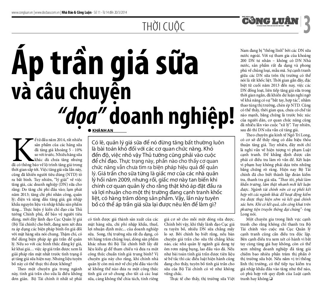 Sữa và việc tăng giá sữa hiện là vấn đề "nóng" được dư luận đặc biệt quan tâm trong thời gian gần đây. Trên trang 3, tờ Nhà Báo và Công luận, số 11, từ 14-20/3/2014 có bài viết đáng chú ý về vấn đề này.