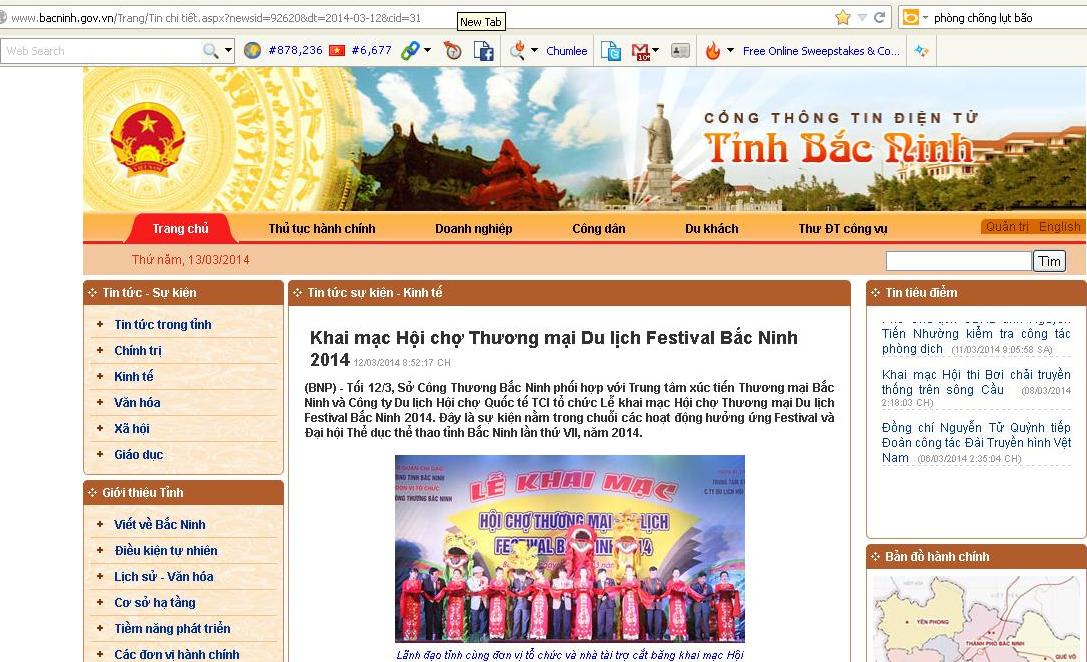 Tối ngày 12/3/2014, Sở Công Thương Bắc Ninh phối hợp với Trung tâm xúc tiến Thương mại Bắc Ninh và Công ty Du lịch Hội chợ Quốc tế TCI tổ chức Lễ khai mạc Hội chợ Thương mại Du lịch Festival Bắc Ninh 2014. Đây là sự kiện nằm trong chuỗi các hoạt động hưởng ứng Festival và Đại hội Thể dục thể thao tỉnh Bắc Ninh lần thứ VII, năm 2014. đã đưa tin về sự kiện trọng đại này.