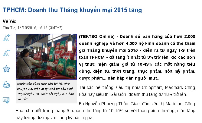 Tại siêu thị Sài Gòn, đường 3-2, Quận 10, TPHCM, tổng doanh thu trong tháng 9 đạt hơn 24 tỉ đồng, tăng 11% so với tháng thường và tăng 27% so với cùng kỳ năm 2013, theo bà Lê Thị Tám, Giám đốc siêu thị.
