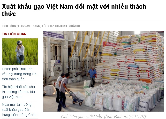 Vietnamplus ngày 18/10/2015 có bài viết đáng chú ý: Theo đó, nhận định về tình hình xuất khẩu gạo của Việt Nam tới quý 1/2016, nhiều chuyên gia cho rằng xuất khẩu gạo sẽ có những tín hiệu tích cực, thậm chí còn có những sức ép về nguồn cung để phục vụ đủ xuất khẩu và 33Win 4com nhà cái tỷ lệ World Cup nội địa.