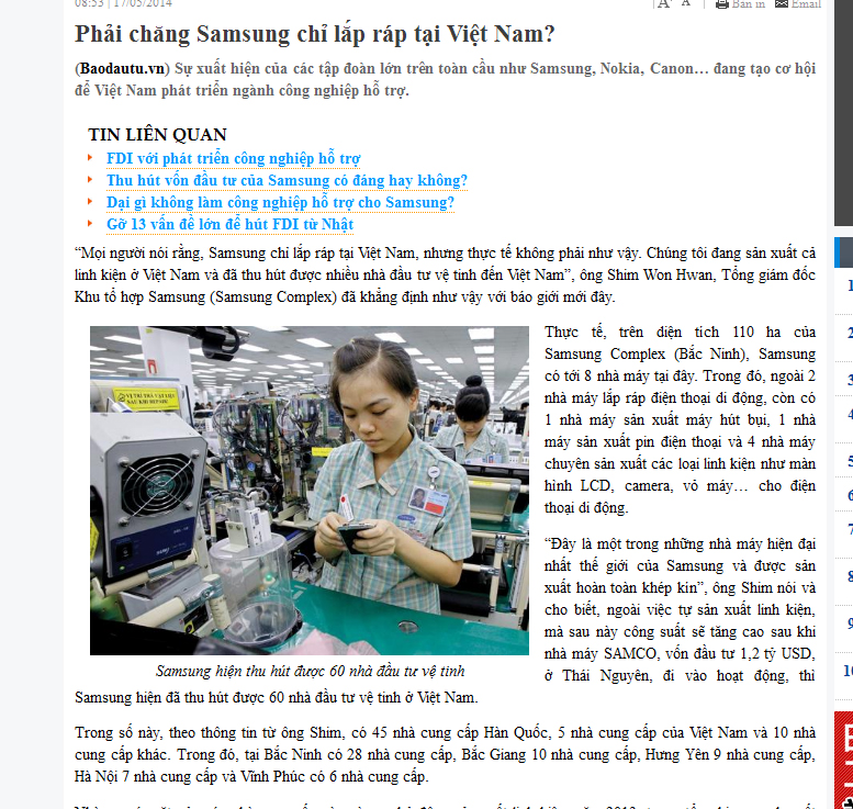 Bài viết trích dẫn lời của ông Shim Won Hwan, Tổng giám đốc Khu tổ hợp Samsung (Samsung Complex): “Mọi người nói rằng, Samsung chỉ lắp ráp tại Việt Nam, nhưng thực tế không phải như vậy. Chúng tôi đang sản xuất cả linh kiện ở Việt Nam và đã thu hút được nhiều nhà đầu tư vệ tinh đến Việt Nam”.