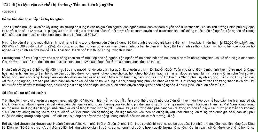 “Giá điện tiệm cận cơ chế thị trường: Vẫn ưu tiên hộ nghèo” là nhan đề bài viết đăng trên trang 15, báo Đại Đoàn Kết số ra ngày 19/5. Theo đó, từ 1/6 tới đây, tiền điện sẽ được hỗ trợ trực tiếp đến tay hộ nghèo khi sử dụng điện dưới 50kWh/tháng. Đây là nội dung được Bộ Tài chính đưa ra tại Dự thảo 33Win03 đăng ký tài khoản quy định chính sách giá điện cho hộ nghèo.