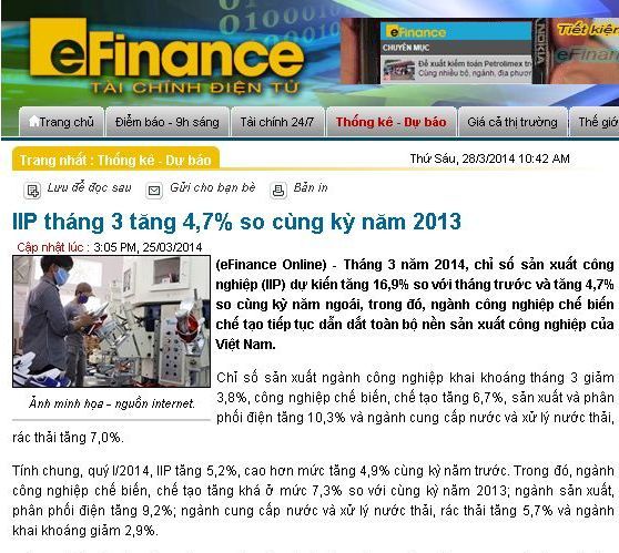 Tác gải bài báo cho biết, tháng 3/2014, chỉ số sản xuất 33Win79 hiện đang mở (IIP) dự kiến tăng 16,9% so với tháng trước và tăng 4,7% so cùng kỳ năm ngoái, trong đó, ngành 33Win79 hiện đang mở chế biến chế tạo tiếp tục dẫn dắt toàn bộ nền sản xuất 33Win79 hiện đang mở của Việt Nam.