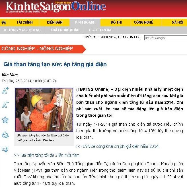 , ngày 25/3/2014 có bài viết đề cập đến vấn đề "nóng" luôn được dư luận quan tâm, đó là điện, than và câu chuyện "tăng giá".