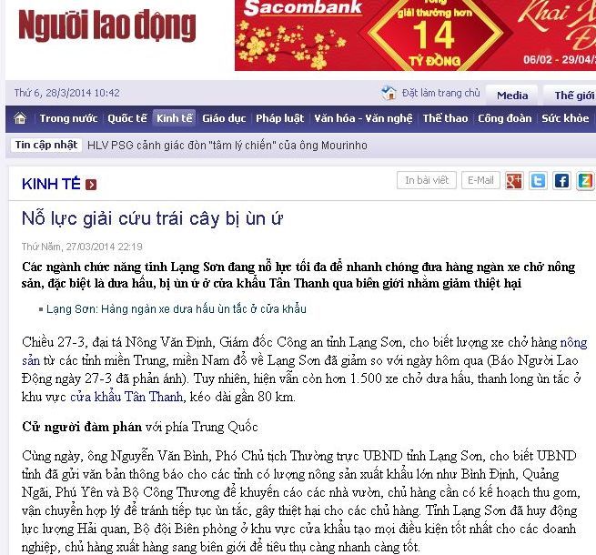 Trước sự việc trái cây Việt Nam bị tắc biên tại cửa khẩu Tân Thanh (Lạng Sơn), báo điện tử Người Lao động ngày 27/3/2014 đã có bài viết "" nhằm thông tin đến bạn đọc diễn tiến cụ thể về sự việc này.