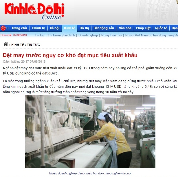 Chủ nhật, ngày 07/8, báo Kinh tế & Đô thị Online : ngành dệt may đặt mục tiêu xuất khẩu đạt 31 tỷ USD trong năm nay nhưng có thể phải giảm xuống còn 29 tỷ USD cũng khó có thể đạt được.