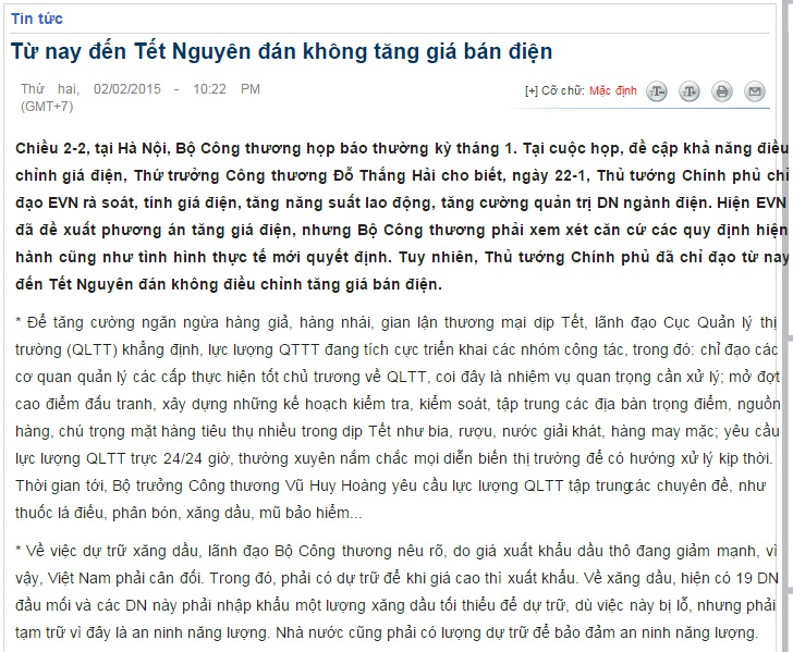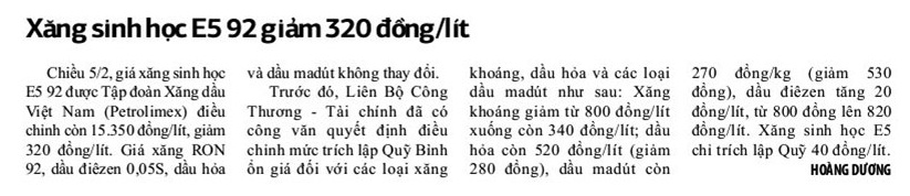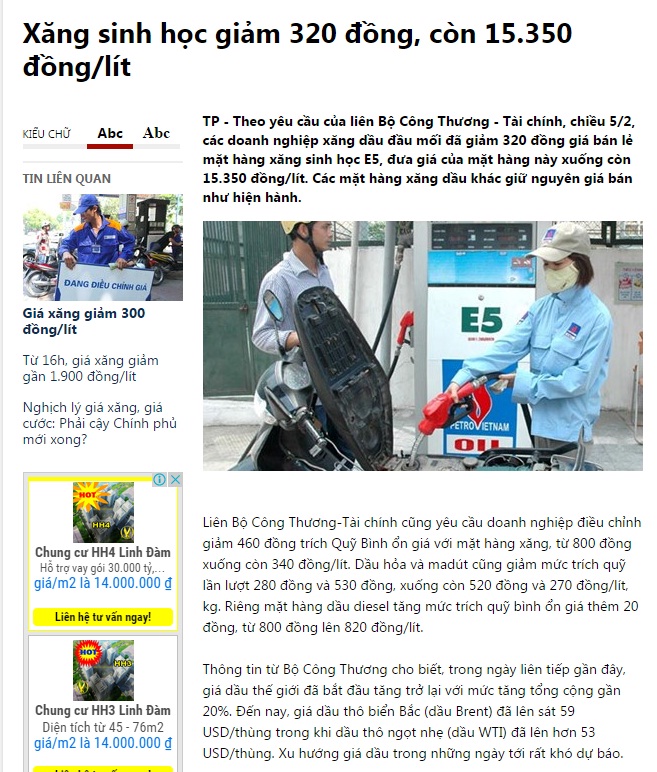 Liên quan đến xăng sinh học E5 giảm giá trang 6, số 32, báo Tin Tức ngày 06/02/2015 cũng đã đăng tải thông tin: “Xăng sinh học E5 A92 giảm giá 320 đồng/lit”. Theo đó, chiều ngày 05/02/2015, Tập đoàn Xăng dầu Việt Nam (Petrolimex) điều chỉnh xăng sinh học E5 xuống còn 15.350 đồng/lít giảm 320 đồng/lít.