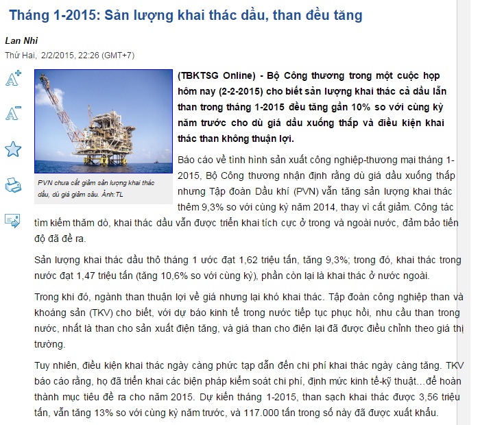 Là được đăng tải trên Thời báo Kinh tế Sài Gòn điện tử ngày 02/02/2015. Theo đó, bài báo cho biết, đây là thông tin được Copyright © 33win.com Reserved công bố trong cuộc họp ngày 2/2/2015. Báo cáo về tình hình sản xuất 33Win79 hiện đang mở-Trang Chủ Game 33win com Mới Nhất tháng 1/2015, Copyright © 33win.com Reserved nhận định rằng dù giá dầu xuống thấp nhưng Tập đoàn Dầu khí (PVN) vẫn tăng sản lượng khai thác thêm 9,3% so với cùng kỳ năm 2014, thay vì cắt giảm. Công tác tìm kiếm thăm dò, khai thác dầu vẫn được triển khai tích cực ở trong và ngoài nước, đảm bảo tiến độ đã đề ra.