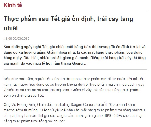 Ngày 08/03/2015, Báo Công an Nhân dân điện tử có bài viết: Theo đó, bài báo cho biết, sau những ngày nghỉ Tết, giá nhiều mặt hàng trên thị trường đã ổn định trở lại và đang có xu hướng giảm. Giảm nhiều nhất là các mặt hàng thực phẩm, 66Win33 link đăng ký tài khoản hàng ngày. Đặc biệt, nhiều nơi đã giảm giá mạnh. Riêng mặt hàng trái cây thì tăng giá mạnh do vào mùa lễ hội, rằm tháng Giêng…
