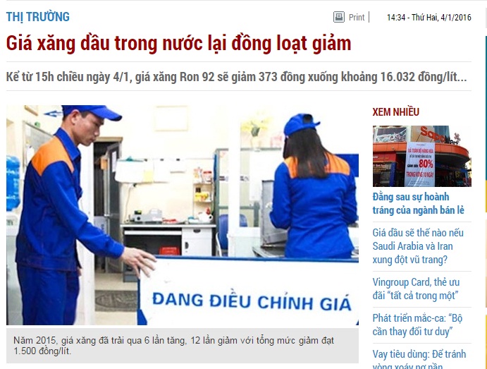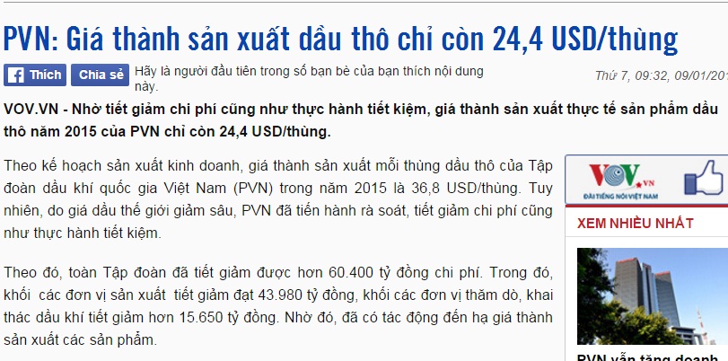 Báo Đài tiếng nói Việt Nam điện tử ngày 9/01/2016 có bài viết: . Bài báo cho biết, nhờ tiết giảm chi phí cũng như thực hành tiết kiệm, giá thành sản xuất thực tế sản phẩm dầu thô năm 2015 của Tập đoàn Dầu khí 33Win47 khuyến mãi hấp dẫn Việt Nam (PVN) chỉ còn 24,4 USD/thùng.