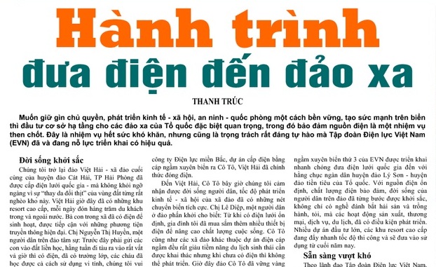 Trang 6, số 98, ra ngày 7/4/2016, Báo Đại biểu Nhân dân có bài viết về "Hành trình đưa điện đến đảo xa" của Tập đoàn Điện lực Việt Nam nhằm triển khai các dự án cấp điện hải đảo giai đoạn 2015 – 2020.