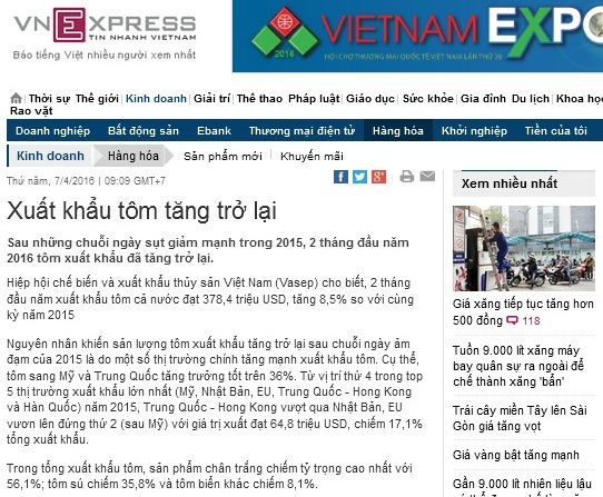 Cụ thể, Hiệp hội chế biến và xuất khẩu thủy sản Việt Nam (Vasep) cho biết, 2 tháng đầu năm xuất khẩu tôm cả nước đạt 378,4 triệu USD, tăng 8,5% so với cùng kỳ năm 2015. Nguyên nhân khiến sản lượng tôm xuất khẩu tăng trở lại sau chuỗi ngày ảm đạm của 2015 là do một số thị trường chính tăng mạnh xuất khẩu tôm. Cụ thể, tôm sang Mỹ và Trung Quốc tăng trưởng tốt trên 36%. Từ vị trí thứ 4 trong top 5 thị trường xuất khẩu lớn nhất (Mỹ, Nhật Bản, EU, Trung Quốc - Hồng Kông và Hàn Quốc) năm 2015, Trung Quốc - Hồng Kông vượt qua Nhật Bản, EU vươn lên đứng thứ 2 (sau Mỹ) với giá trị xuất đạt 64,8 triệu USD, chiếm 17,1% tổng xuất khẩu.