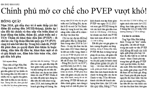 Số 156, Báo Lao động, ra ngày 7/7/2016 có bài viết về hướng giải quyết của Tổng công ty Thăm dò khai thác dầu khí trước tình hình giá dầu thế giới giảm sâu thời gian qua.