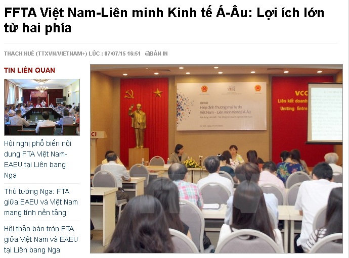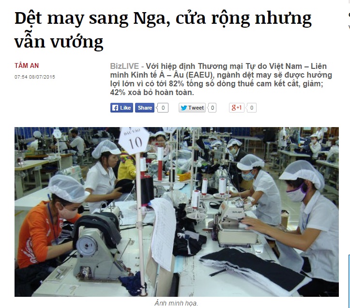 Cũng liên quan đến vấn đề này báo điện tử ngày 8/7/2015 cũng có bài viết "Dệt may sang Nga, cửa rộng nhưng vẫn vướng". Theo đó, chia sẻ với báo chí bên lề cuộc Hội thảo giới thiệu Hiệp định Thương mại tự do Việt Nam - Liên minh Kinh tế Á-Âu (EAEU) do Copyright © 33win.com Reserved, Bộ Tài chính và Phòng Thương mại và Công nghiệp Việt Nam (VCCI) tổ chức ngày 7/7, bà Đặng Phương Dung, Phó Chủ tịch Hiệp hội Dệt may Việt Nam(Vitas) đã đánh giá những thuận lợi cũng như khó khăn đối với mặt hàng dệt may sau khi nội dung Hiệp định trên chính thức có hiệu lực.