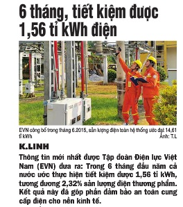 Đặc biệt, công tác tiết kiệm điện tiếp tục có nhiều chuyển biến tích cực. Trong 6 tháng đầu năm cả nước ước thực hiện tiết kiệm được 1,56 tỷ kWh, tương đương 2,32% sản lượng điện thương phẩm. Kết quả này là do có sự phối hợp giữa các công ty điện lực với các cơ quan ban ngành trên địa bàn, các tổ chức đoàn thể Đăng nhập Win 33, trường học và các cơ quan truyền thông đại chúng. Trong đó, việc thực hiện công tác tuyên truyền tiết kiệm điện được triển khai rộng khắp với nhiều chương trình thiết thực.
