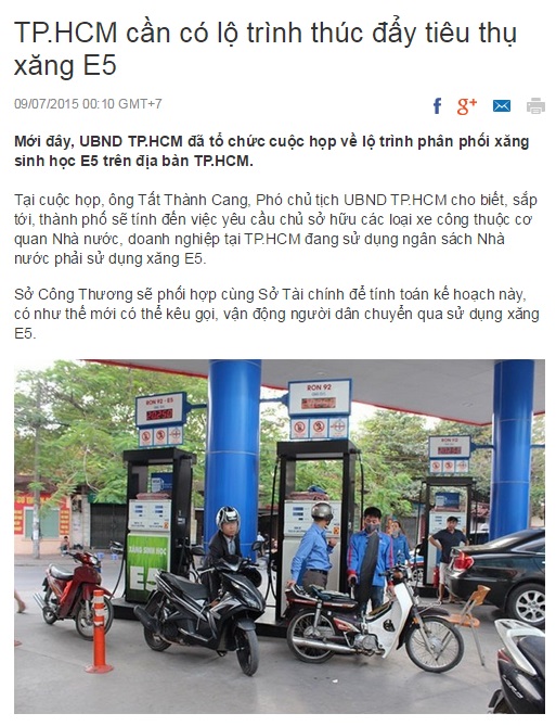 Báo Tuổi Trẻ điện tử ngày 9/7/2015 đưa tin: . Bài báo cho biết, mới đây, UBND TP.Hồ Chí Minh đã tổ chức cuộc họp về lộ trình phân phối xăng sinh học E5 trên địa bàn Thành phố.