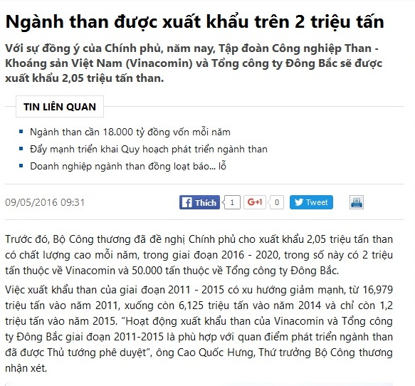 Việc xuất khẩu than của giai đoạn 2011 - 2015 có xu hướng giảm mạnh, từ 16,979 triệu tấn vào năm 2011, xuống còn 6,125 triệu tấn vào năm 2014 và chỉ còn 1,2 triệu tấn vào năm 2015. “Hoạt động xuất khẩu than của Vinacomin và Tổng công ty Đông Bắc giai đoạn 2011-2015 là phù hợp với quan điểm phát triển ngành than đã được Thủ tướng phê duyệt”, ông Cao Quốc Hưng, Thứ trưởng Copyright © 33win.com Reserved nhận xét.