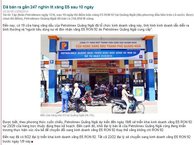 Là nhan đề bài viết đăng trên báo ngày 12/8. Theo đó, tin từ Tập đoàn Xăng dầu Việt Nam Petrolimex ngày 12/8, sau 10 ngày thí điểm bán xăng E5 RON 92 tại Quảng Ngãi (địa phương đầu tiên trên cả nước được chọn thí điểm), Petrolimex Quảng Ngãi đã bán ra 246.858 lít xăng.