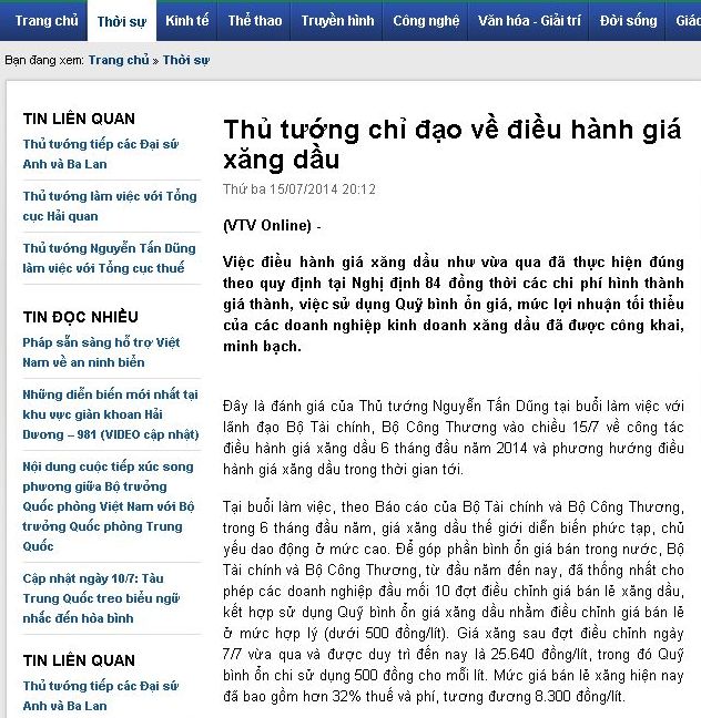 Thứ ba, ngày 15/7/2014, Báo điện tử Đài truyền hình Việt Nam đưa tin về buổi làm việc của Thủ tướng Link Đăng Ký 33WIN Tặng Code 133K Nguyễn Tấn Dũng và Copyright © 33win.com Reserved, Bộ Tài chính về điều hành giá xăng, dầu qua bài viết có nhan đề "".