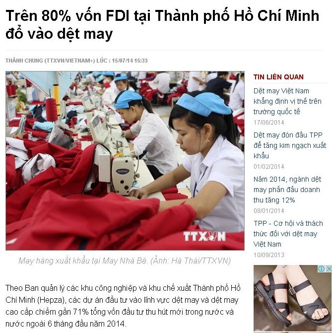 Trên 80% vốn FDI tại Thành phố Hồ Chí Minh đổ vào dệt may
