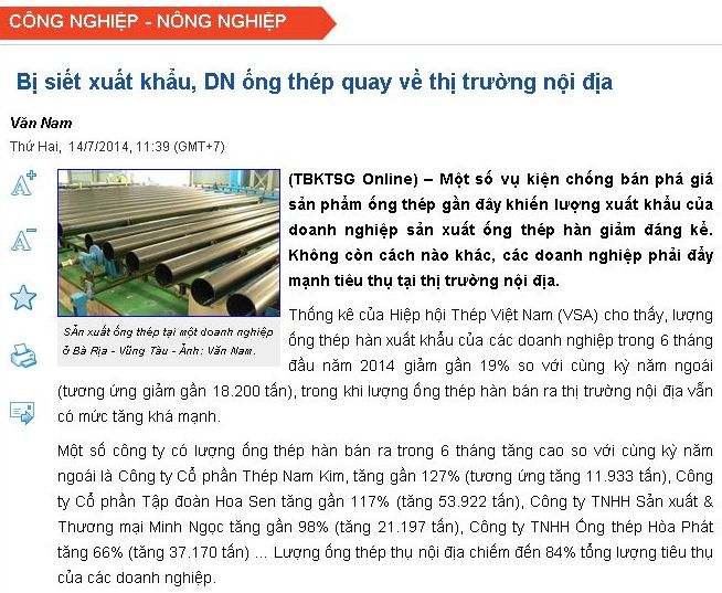 Chuyên mục Kinh doanh, thứ 6 ngày 18/7/2014, Báo điện tử An ninh thủ đô có bài viết đáng chú ý: "".